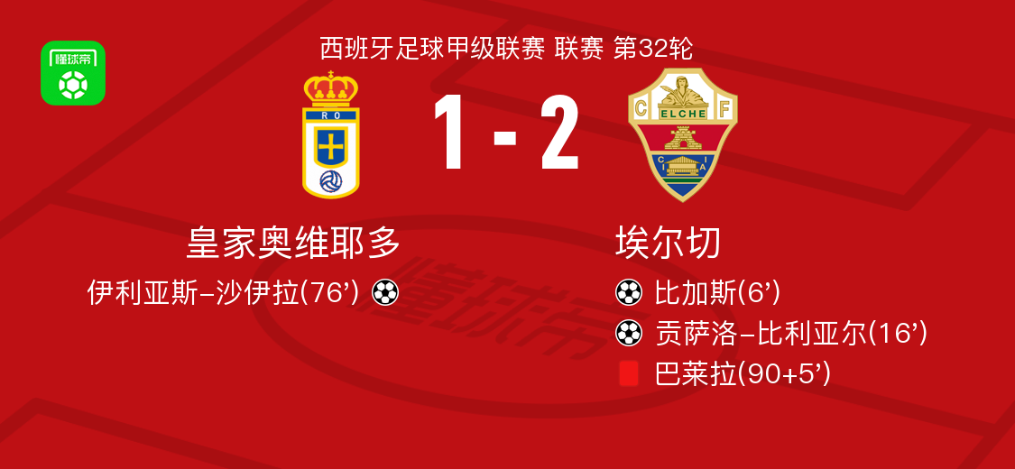北京时间4月26日西班牙足球甲级联赛 联赛 第32轮,皇家奥维耶多主场对阵埃尔切。皇家奥维耶多伊利亚斯-沙伊拉破门。埃尔切比加斯破门,贡萨洛-比利亚尔破门。最终比分皇家奥维耶多 1-2 埃尔切。